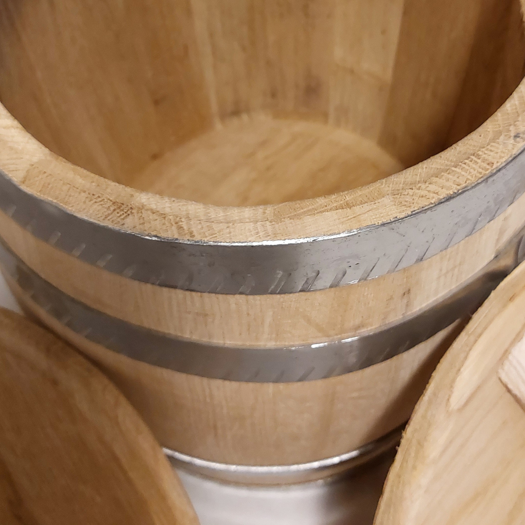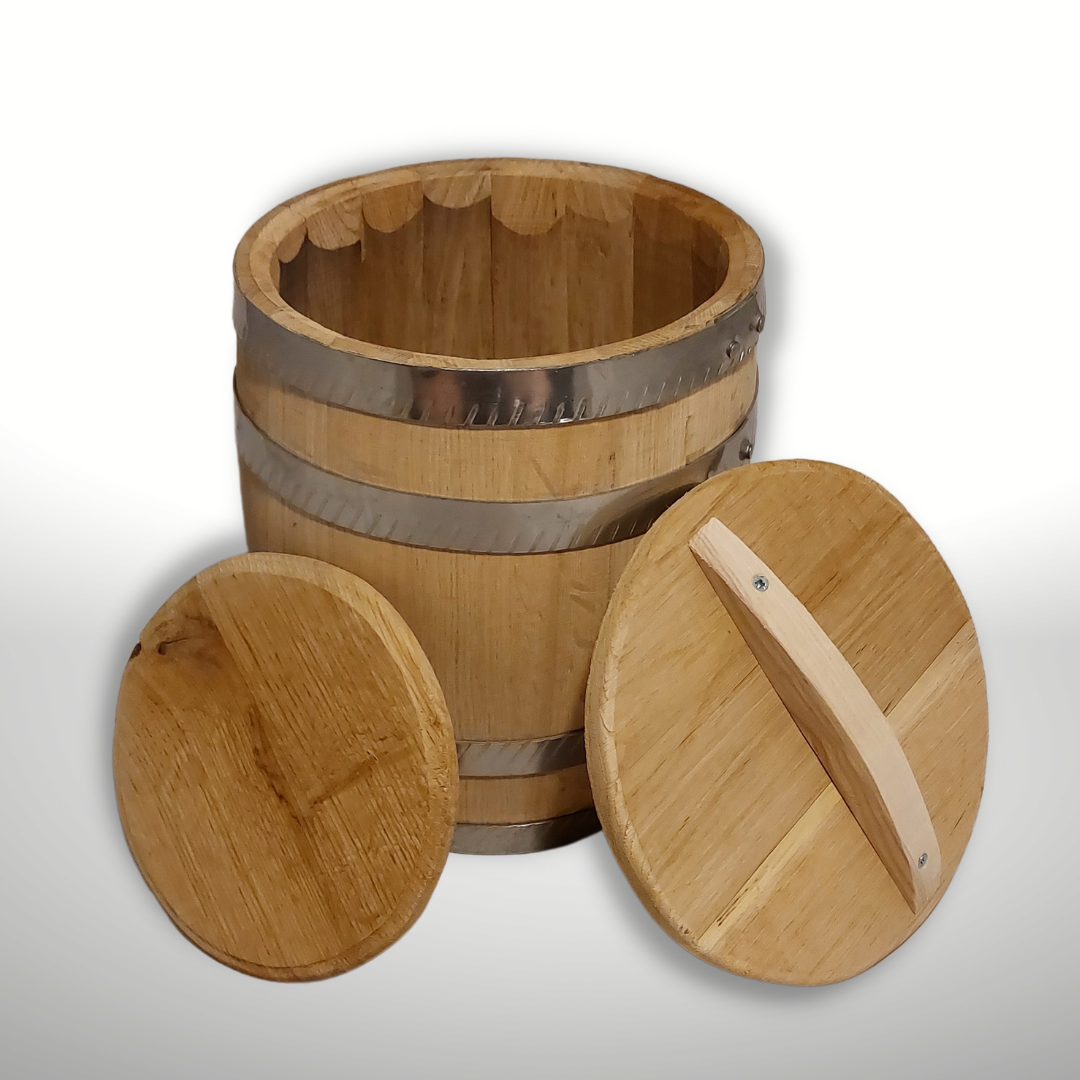 Oak bucket for pickling from oak, with a lid, a bend and weges.85,00 € – 130,00 €Price range: 85,00 € through 130,00 €