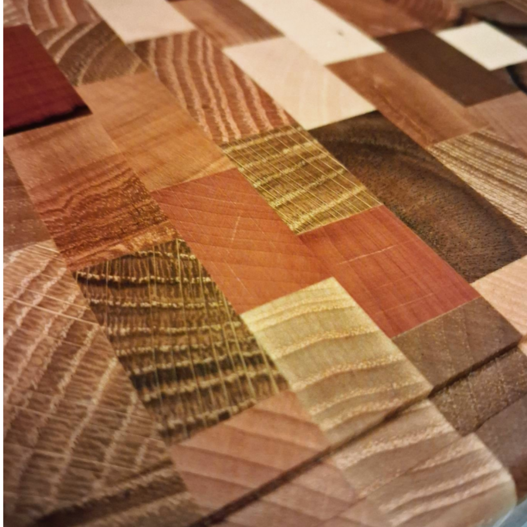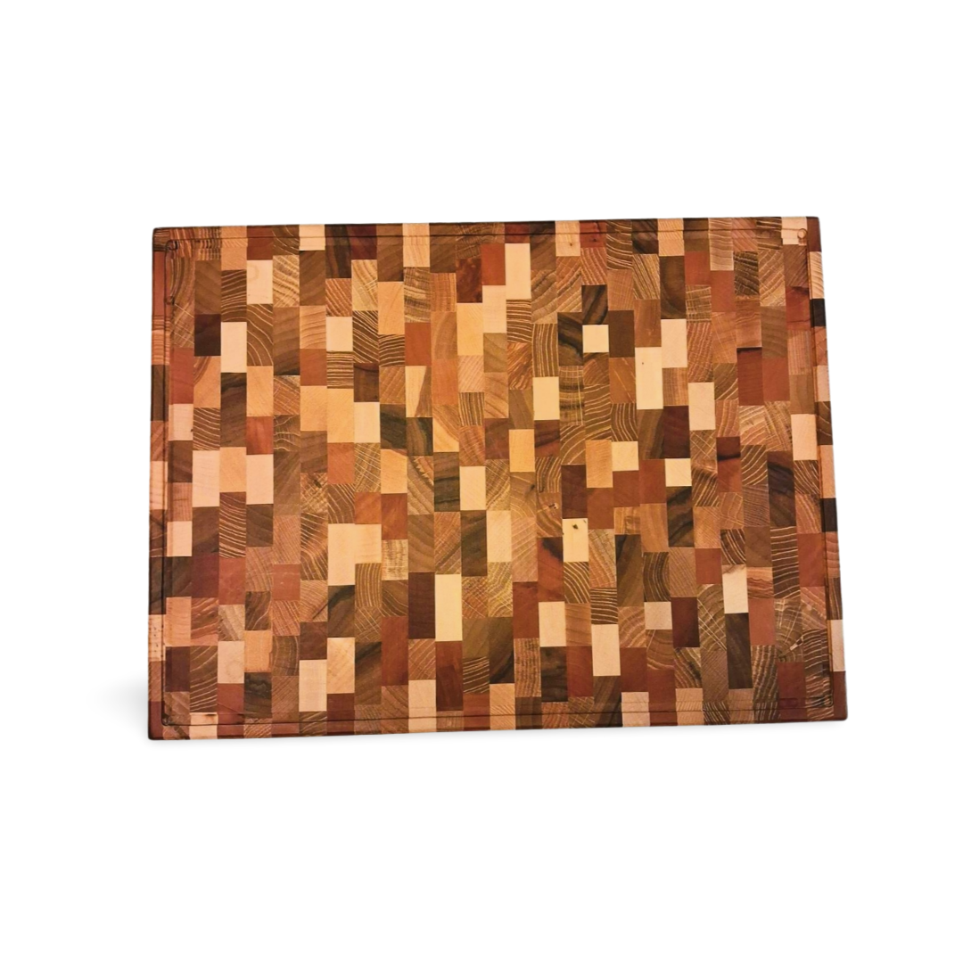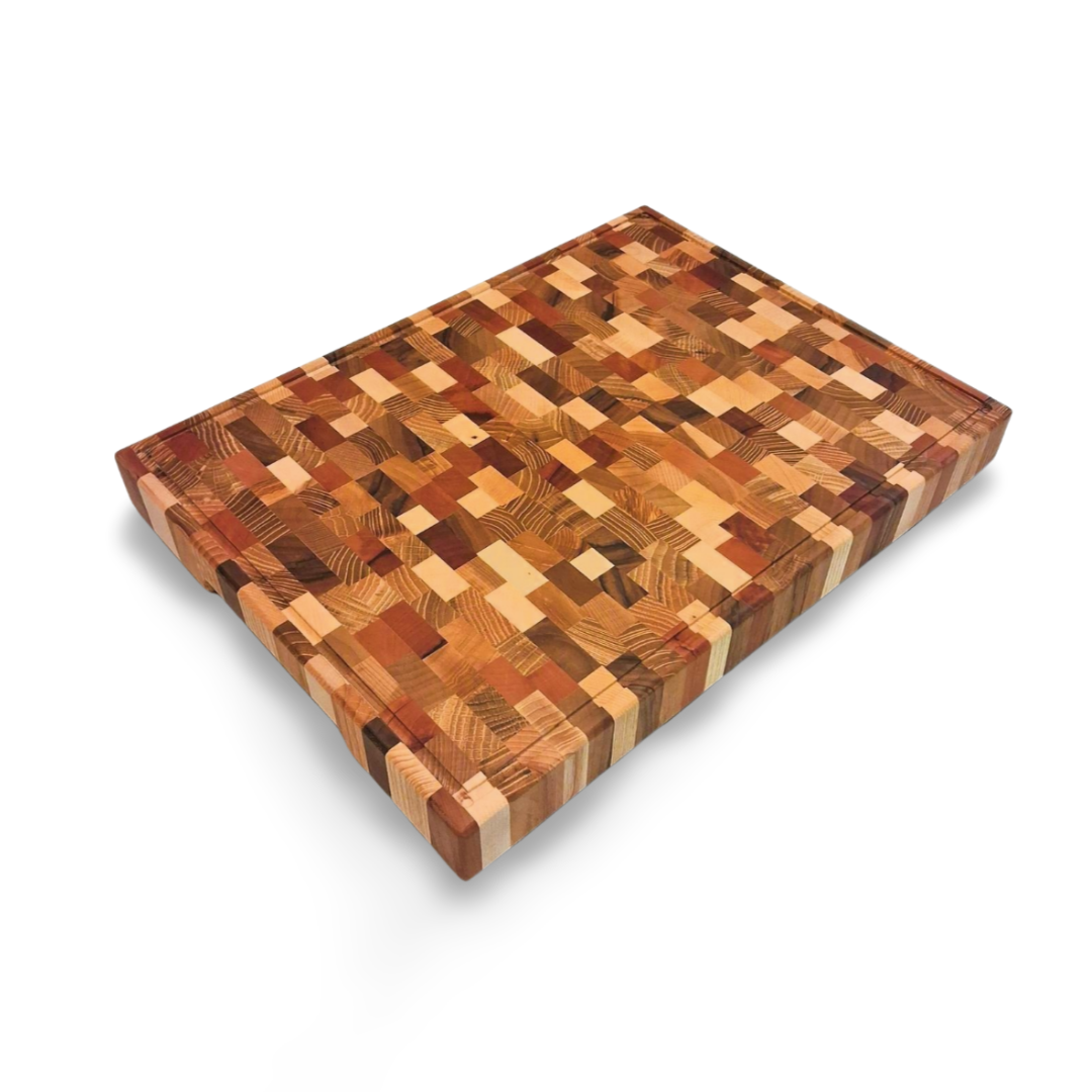 A durable and high-quality solid wood cutting board made using end-grain construction. It is assembled from multiple wooden blocks, creating a beautiful mosaic pattern and ensuring excellent strength and stability.
