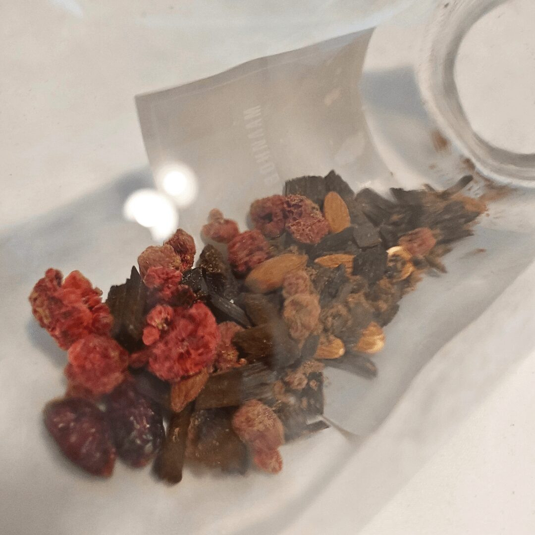 tammelaastud, kuivatatud vaarikad, röstitud mandlid, muskaatpähkel, rosinad, kibuvitsamarjad